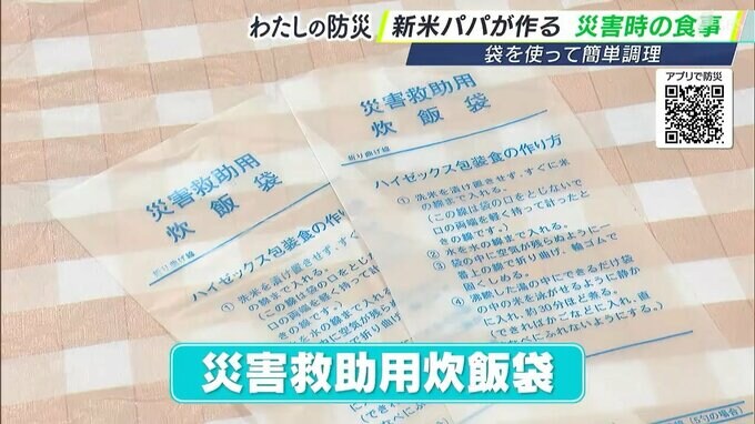 「災害救助用炊飯袋」はお米を研がずに炊くことができるので、水の節約にもなります。