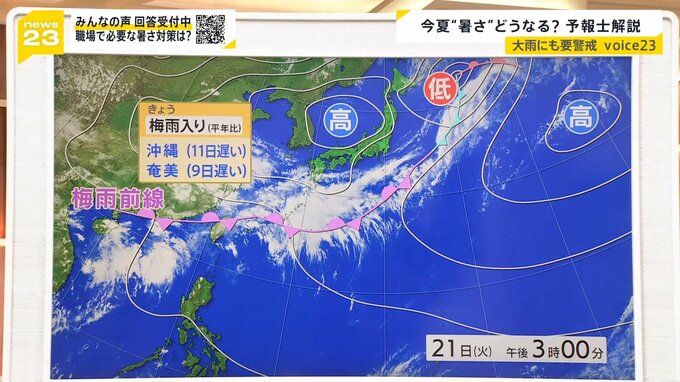 もう既に雨に気をつけたい時期に入ってきています。21日は沖縄と奄美地方で梅雨入りの発表がありました。平年と比べると遅いのですが、それでも季節の歩みが遅いとも言い切れず、既に日本付近にはかなり暑い空気が入ってきている状況です。
