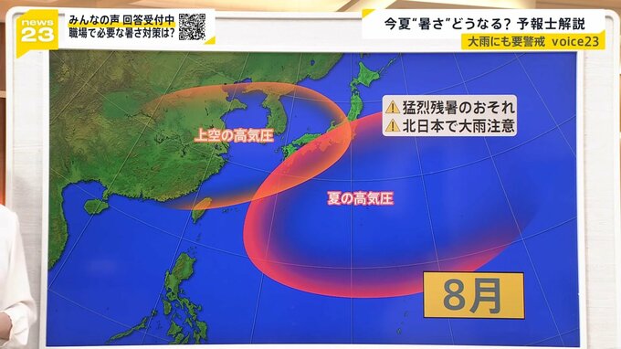 8月になると高気圧が少し北に伸びるのですが、北日本は大雨の恐れが出てきます。また上空から高気圧が被さってくる予想、その頃に猛暑のピークがやってきそうです。残暑に入る時期ではあるのですが、今年の場合は猛烈な残暑が起こるかなという見立てです。