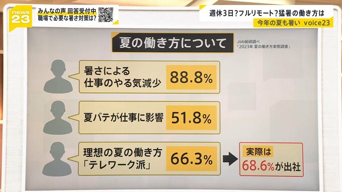 ・理想の夏の働き方、「テレワーク派」:66.3%(実際は68.6%が出社)