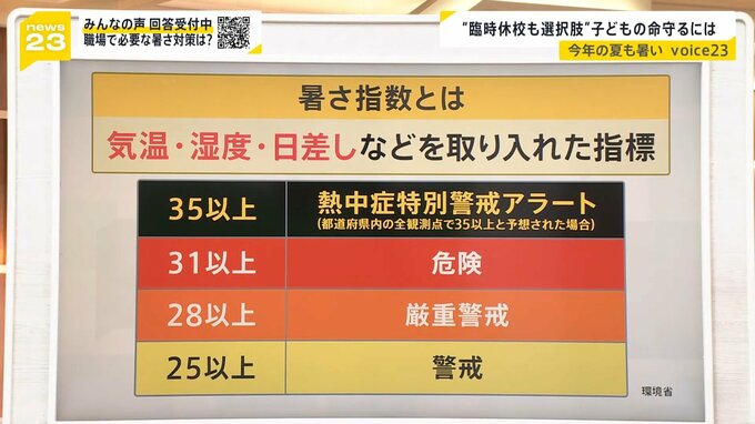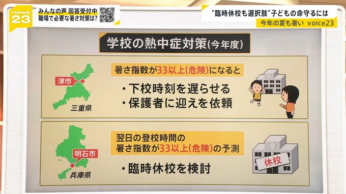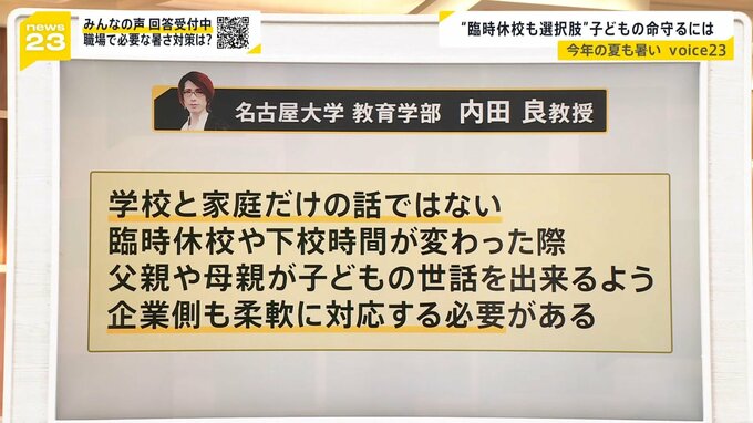 名古屋大学教育学部の内田良教授によりますと、“暑さを災害と同じように配慮している点では前向き。ただ、学校と家庭だけの話ではない。臨時休校や下校時間が変わった際、父親や母親が子どもの世話をできるよう企業側も柔軟に対応する理解する必要がある”ということです。