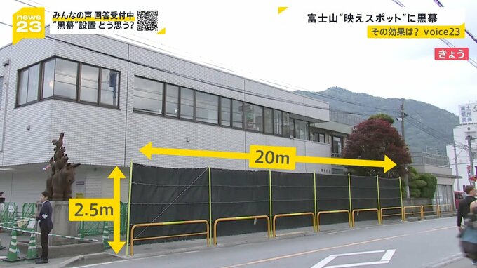 富士山を撮影しようとやってきた観光客の迷惑行為。町は警備員の配置や注意書きを設置しましたが改善されず、打ち出したのが高さ2.5メートル、幅20メートルの黒幕でした。