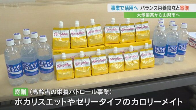 熱中症対策や高齢者の栄養状態をパトロールする事業で活用するため、山梨市に大手製薬会社からバランス栄養食などが贈られました。