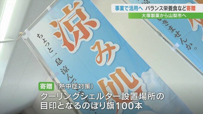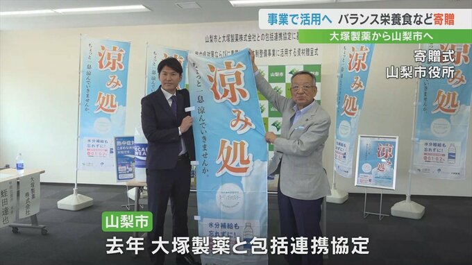 山梨市と大塚製薬は去年、熱中症対策などで連携する協定を結んでいてきょう22日は大塚製薬から製品などが贈られました。
