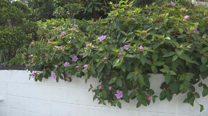 淡い紫色の可憐な花を咲かせる「ノボタン」が、うるま市の民家で見ごろを迎えています。