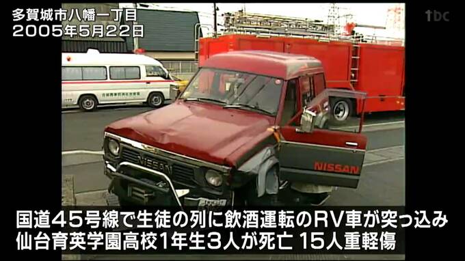 2005年5月22日午前4時過ぎ、多賀城市八幡一丁目の国道45号線で、ウォークラリーをしていた生徒の列に飲酒運転のRV車が突っ込み、仙台育英学園高校1年生の3人が死亡、15人が重軽傷を負いました。