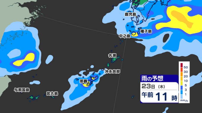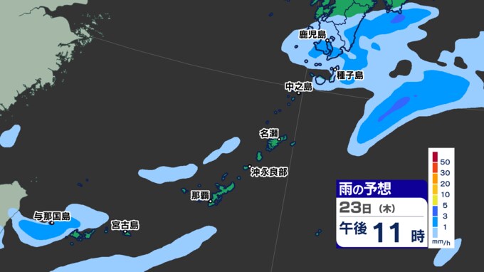鹿児島県奄美地方にある梅雨前線が23日(木)にかけて、種子島・屋久島付近まで北上する見込みです。