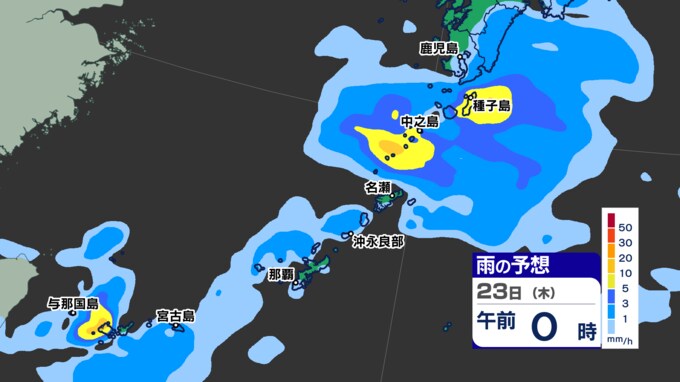 前線が近づく、種子島・屋久島地方は23日(木)夕方にかけて前線の活動の状況によっては、大雨警報が発表される可能性があります。