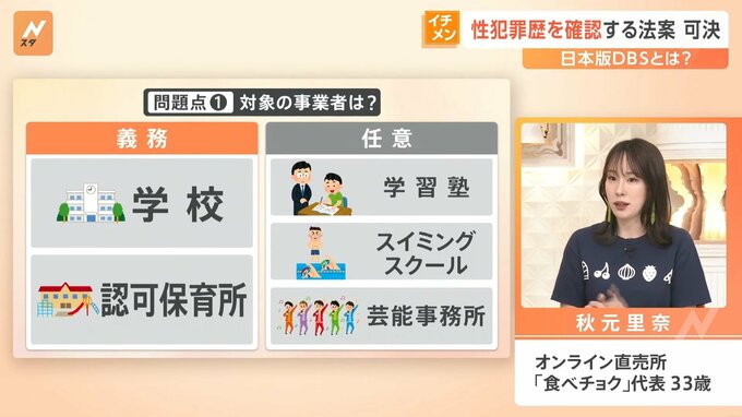 なので、まずは国が前科情報を提供する先として、子どもに接する学習塾、スイミングスクール、芸能事務所などを任意の制度の対象にした、というところになってきます。