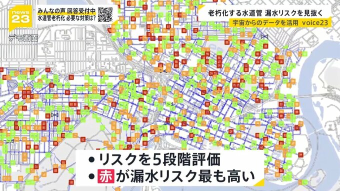 「赤いところが、ここ2年ぐらいで漏水する確率が一番高い。赤が集中しているこのあたりで、漏水調査、調べてみてはどうですかという形でお使いいただいている」