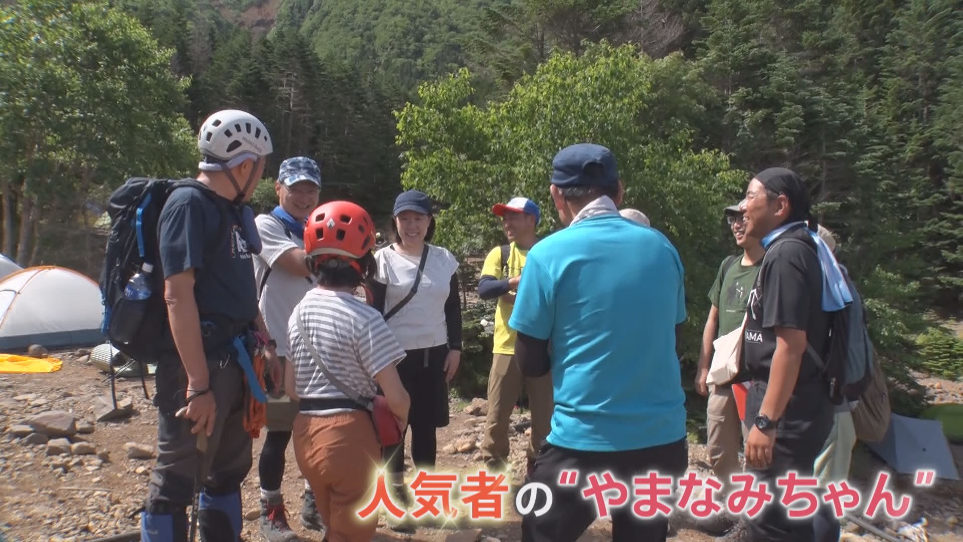 登山者たちに声を掛けられる人気者のやまなみちゃん。