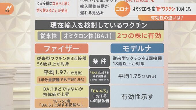 では新しいワクチンは、今流行しているBA.5に有効性はあるのでしょうか?ファイザーとモデルナの2つのワクチンを比べていきたいと思います。輸入を検討している新しいワクチンは、従来株とオミクロン株(BA.1)の2つの株に有効な成分が含まれています。