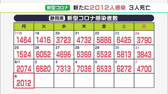 8月8日、静岡県内では新たに2012人が新型コロナウイルスに感染したことが分かりました。新たな感染者は9日ぶりに前の週の同じ曜日を下回っています。感染者を自治体別に見ますと、浜松市が599人、静岡市が319人、…