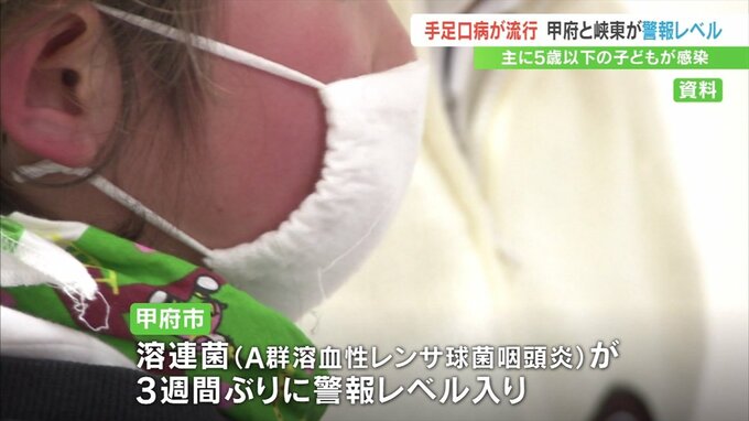 このほか甲府市では突然の発熱やのどの痛みが起こる「溶連菌」の感染者が増加し、3週間ぶりに警報レベル入りしました。