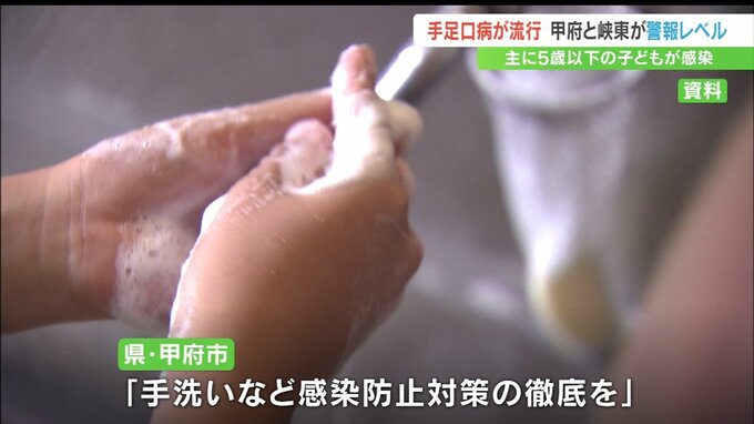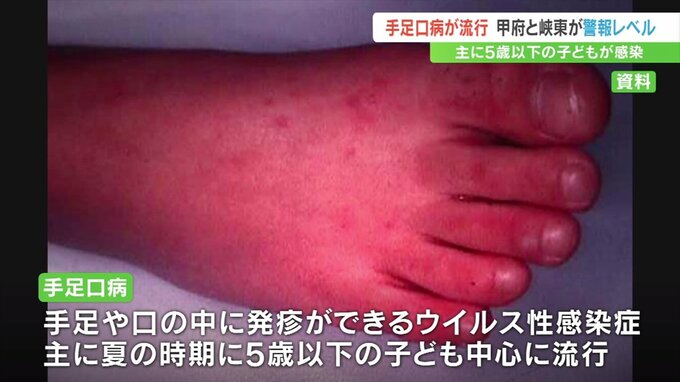 手足や口の中に発疹が出来る「手足口病」の流行が拡大し、甲府市と峡東で警報レベルになりました。