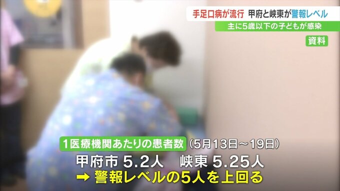 この手足口病の1週間の患者の数が1医療機関の平均で、甲府市で5.2人、峡東で5.25人となり、警報レベルの5人を上回りました。