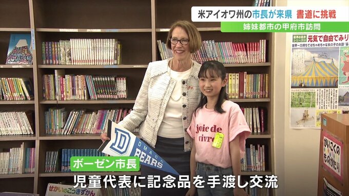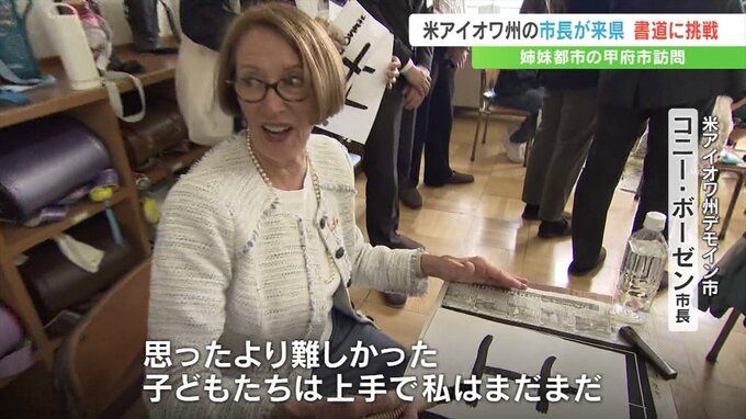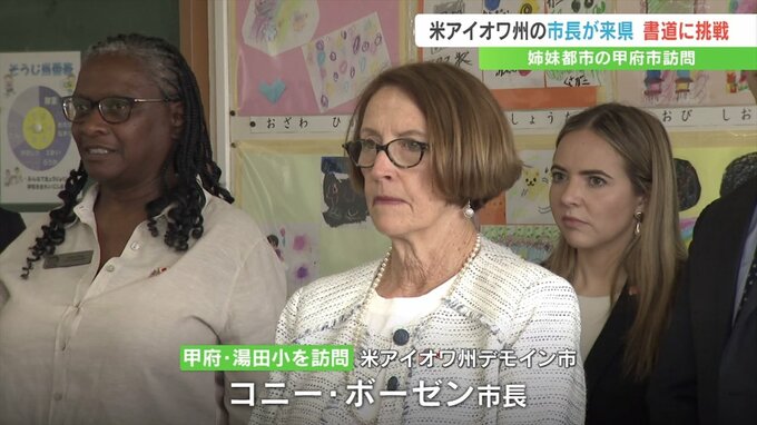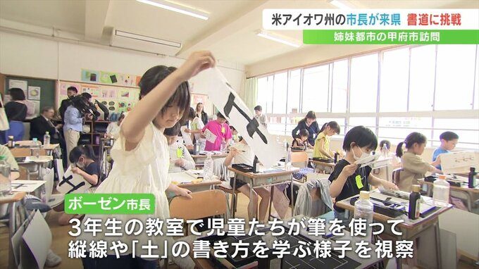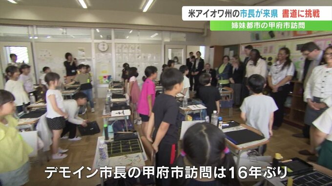 デモイン市長の甲府市訪問は16年ぶりで、3年生の教室で児童たちが筆を使って縦線や漢字の「土」の書き方を学ぶ様子を視察しました。