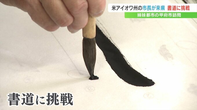甲府市の姉妹都市アメリカ・アイオワ州、デモイン市の市長が来県し、甲府市の小学校の授業で毛筆に挑戦しました。
