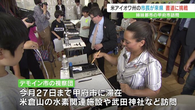 甲府市の姉妹都市アメリカ・アイオワ州、デモイン市の市長が来県し、甲府市の小学校の授業で毛筆に挑戦しました。