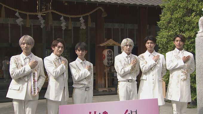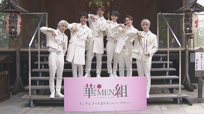 5月22日にデビューしたアイドル歌謡グループ「華 MEN 組」(読み:かめんぐみ)のコウジ(石綿 宏司)さん、ユウキ(勝村友紀)さん、ユッキー(内田結稀)さん、タクミ(橋口巧)さん、ダイキ(一戸大輝)さん、コウキ(山口晃生)さんが、デビュー・ミニアルバム「華やかに抱きしめて」のヒット祈願を東京・神楽坂の赤城神社で行いました。その後、メンバーは囲み取材に応じ、デビューした心境を語りました。