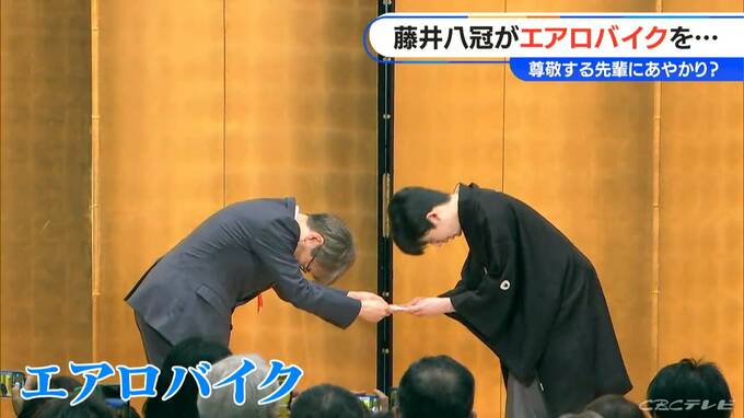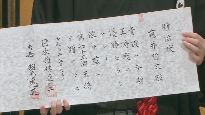ことし2月、菅井竜也八段の挑戦を退け「王将」3連覇を達成。23日は、タイトルを認定する贈位状やトロフィーなどのほか、自らリクエストした記念品「エアロバイク」の目録が贈られました。