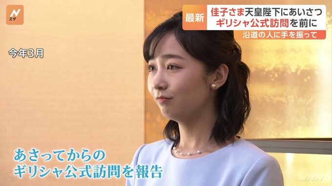 あさってからギリシャを公式訪問する秋篠宮家の次女・佳子さまが、出発前に天皇陛下にあいさつをするため皇居を訪問されました。佳子さまは午後5時半ごろ、皇居・半蔵門で集まった人たちに窓を開けて手を振り、に…