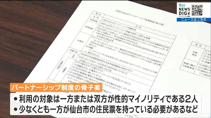 審議会には、大学教授や弁護士ら11人が出席し、仙台市の担当者からパートナーシップ制度の骨子案について説明を受けました。骨子案では、制度利用の対象を一方または双方が性的マイノリティである2人としています。