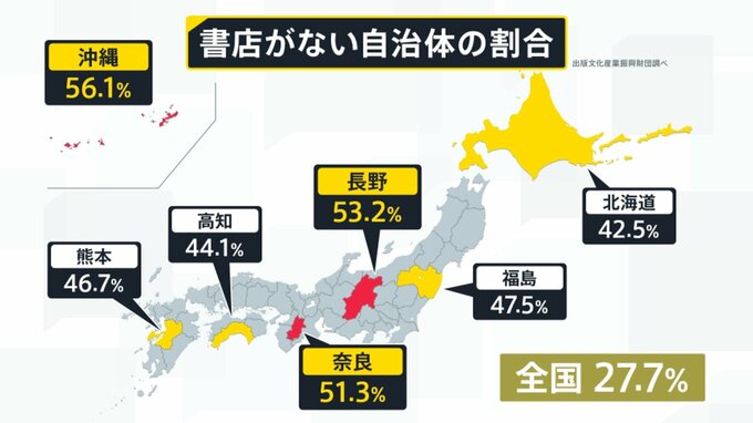 また、書店がない自治体の割合は▼全国で27.7%となっていて、さらに▼長野:53.2%、▼奈良:51.3%、▼沖縄:56.1%の県内では半数以上の自治体に書店がない状況です。