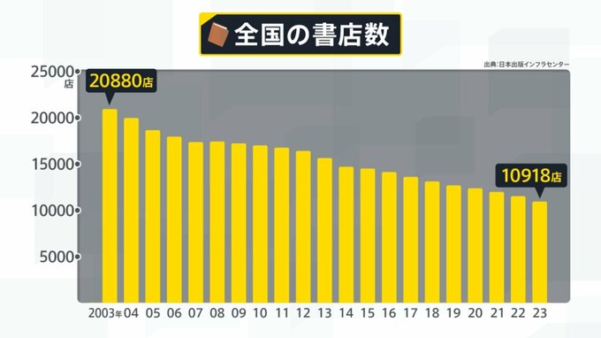 書店が全国で減ってきています。全国の書店数は▼2003年は20880店でしたが、▼2023年には10918店と20年間で約半分にまで減少しています。