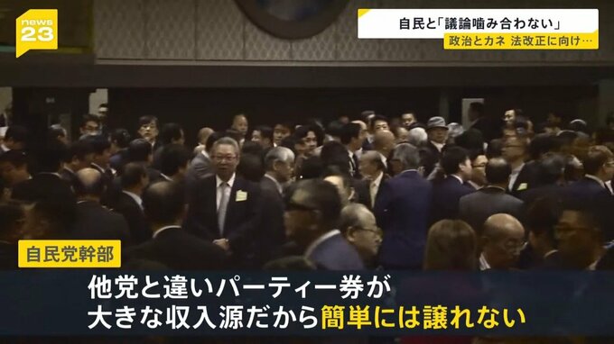 パーティー券の相場が1枚2万円であることを踏まえ、ある自民党幹部は「5万円ではパーティー券が2枚しか売れなくなる。他党と違いパーティー券が大きな収入源だから簡単には譲れない」と話します。