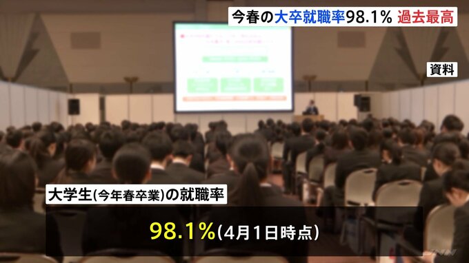 今年春に卒業した大学生の就職率が98.1%で、過去最高になったことが分かりました。厚生労働省と文部科学省の共同調査によりますと、今年春に卒業した大学生の就職率は今年4月1日の時点で98.1%でした。前の年の同じ…