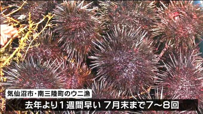 24日、宮城県気仙沼市と南三陸町の海域では初夏の風物詩ウニ漁が始まりました。このうち南三陸町戸倉地区にある漁港では、午前5時の解禁とともに漁船10隻余りが漁場に向かいました。そして、漁師たちが箱眼鏡を使…
