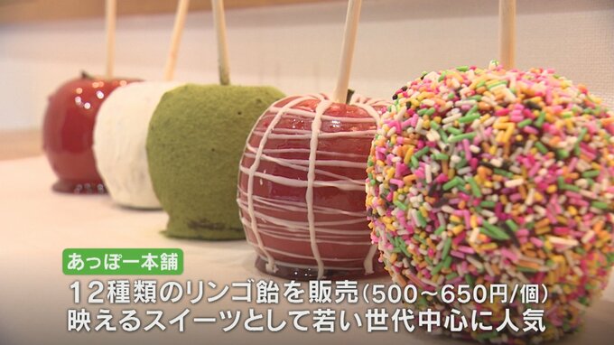 12種類のりんご飴を販売していて「映えるスイーツ」として若い世代を中心に人気を集めています。