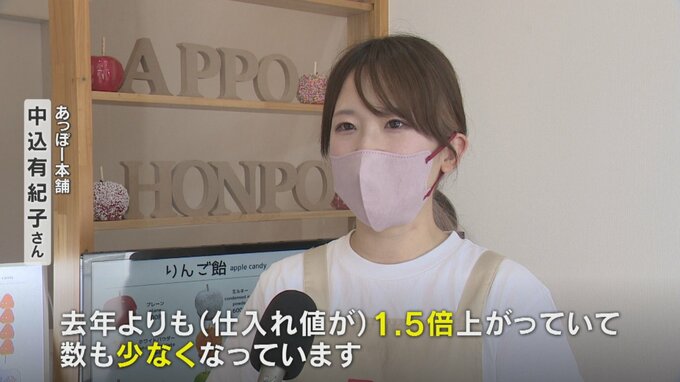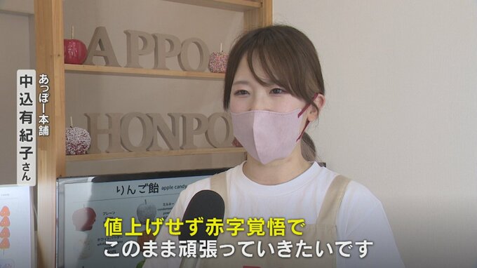 「今リンゴの価格が高騰している中、あっぽー本舗としてはたくさんのお客さんにりんご飴を手に取っていただきたいので値上げせず赤字覚悟でこのまま頑張っていきたいです」