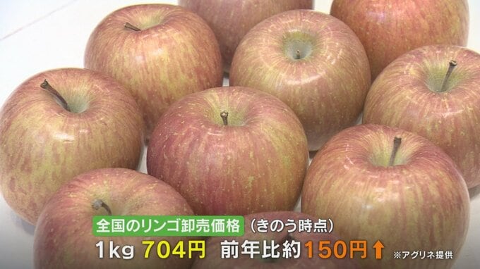 農林水産省のデータによりますと、全国のリンゴの卸売価格は5月23日時点で1kg704円と去年の同じ時期と比べて約150円値上がりしています。