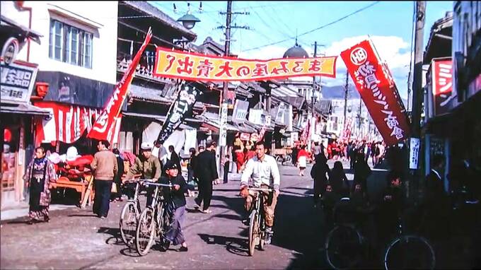 この写真は、73年前の石巻市中心部の商店街です。大売出しの横断幕の下を、自転車に乗った人たちが行き交います。写真展では、1951年にアメリカ軍の医師として来日したジョージ・バトラー大尉が撮影した145点が展示されています。バトラー大尉は、現在の航空自衛隊松島基地に勤務しながら、当時としては珍しいカラーフィルムで周辺のまち並みなどを収めました。