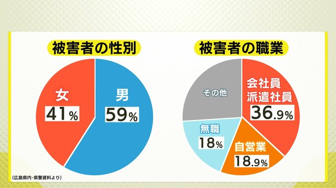 広島県警がまとめた今年1月から4月末までの県内におけるSNS型投資詐欺・ロマンス詐欺の被害状況をみると、被害は毎月増えていき、被害者は50代が3割を占めます。以下、詳細です。