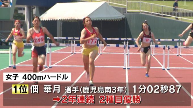 鹿児島市の白波スタジアムで行われた陸上競技。女子400メートルハードルでは、24日、400メートルを制した鹿児島南の佃が出場。大きなストライドで序盤からスピードに乗り、1分02秒87で優勝。2年連続で2種目を制し…