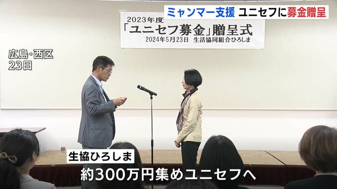 募金に取り組んだのは生協ひろしまで、およそ300万円が集まりました。国連組織・ユニセフに目録が手渡されました。