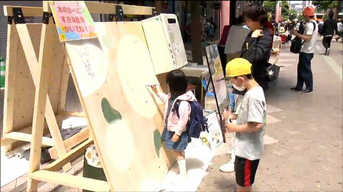 イベントには、福祉サービス事業所や企業などおよそ30の団体が参加しました。壁面材と給湯器で壁画をつくるブースでは、訪れた人が自由にイラストなどを書き込んでいました。