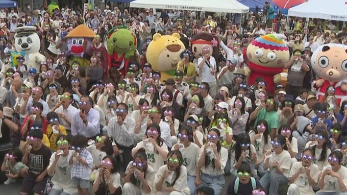 26日にJR熊野市駅前の広場で行われたイベントには、「目を見張る」ならぬ、「目が飛び出た」おもちゃのメガネをかけた大勢の人が集まり、一斉に「めはり寿司」を頬張りました。