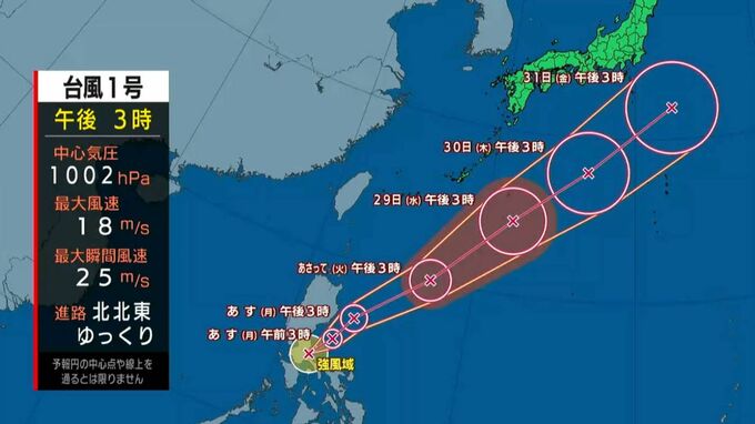 26日に発生した台風1号は、フィリピン付近を北北東へ進んでいて、鹿児島県内には29日から30日にかけて最接近する見込みです。気象台によりますと、台風1号は午後3時現在、フィリピン付近にあって、中心の気圧は100…