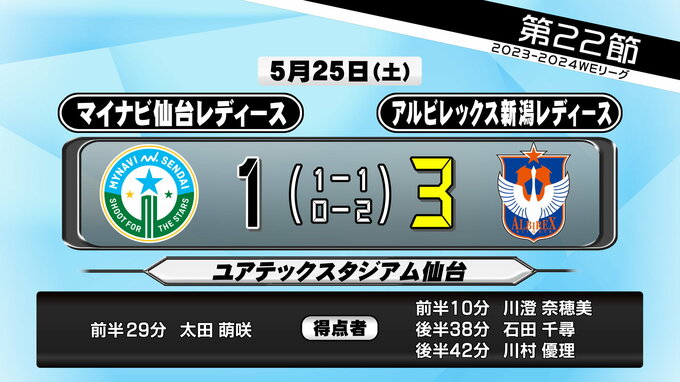 しかし、終盤、スタミナで上回ったのは新潟でした。残り10分を切ったところで新潟の追加点。その後3点目も奪われ力負けを喫したマイナビ仙台レディース、最終順位は5勝6分11敗と下位に沈んだシーズンとなりました。