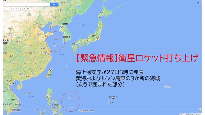 落下が予想されるとしている海域は計3か所です。海上保安庁は、黄海上の2か所と、フィリピン・ルソン島東側の1か所に対して、エリアを公表して航行警報を発表、船舶などに落下物への注意を呼びかけています。