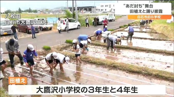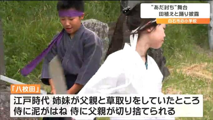 歌舞伎の演目、「奥州白石仇討噺」の舞台になった宮城県にある田んぼで27日、小学生が田植えを行いました。
