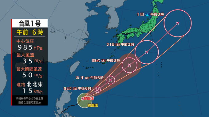 また、28日午前6時時点でフィリピンの東には強い台風1号があって、北北東に1時間に15キロの速さで進んでいます。中心気圧は985ヘクトパスカル、中心付近の最大風速は35メートルです。今後30日(木)にかけて発達し日本列島の南海上を進むでしょう。