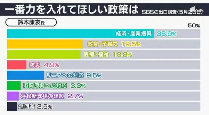 「SBSの出口調査によりますと、鈴木康友さんに投票した人の4割近くが経済産業振興に力を入れてほしいよと回答したんですね。鈴木さん、この有権者の声どのように受け止めますか」