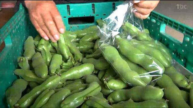 足立地区の農家、村上博さんのところでもいま、収穫作業に追われています。ソラマメは、今が旬ということで、村上さんは鮮やかな緑色に大きく育ったものを選んで一個一個ていねいにもぎ取っていました。