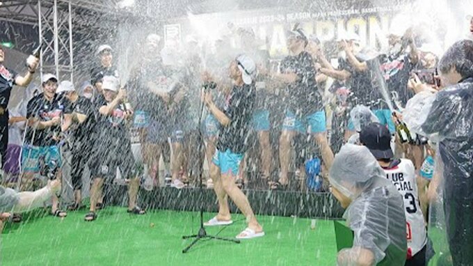 試合後、今季で引退を表明していた元日本代表の朝山正悟(42)は「最後に最高の仲間たちと最高の景色が見られた、横浜からバスケ人生が始まり横浜で終えられた」と話し、何度も「最高です」と繰り返した。その後に行われたシャンパンファイトでは「全国のバスケットボールファンの皆さん、広島のファンの人いきますよ!1、2、3、乾杯~」と号令をかけ選手たちと喜びを分かちあった。
