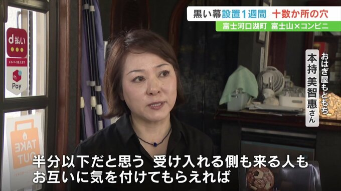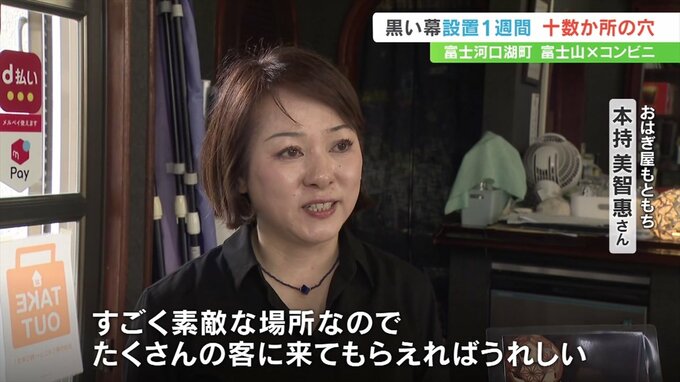外国人観光客による迷惑行為への対策として富士山の麓のコンビニエンスストア前に黒い幕が設置されて1週間。